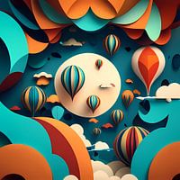 Een levendige en grillige illustratie van heteluchtballonnen met gedurfde, kleurrijke strepen die vredig zweven in een surrealistische lucht. De achtergrond bestaat uit wervelende kleuren en gestileerde wolken die de dromerige kwaliteit van de scène versterken. In het midden staat een grote ronde zon of maan centraal, die een zacht…