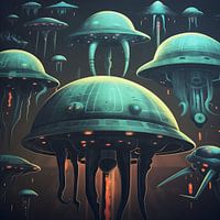 Celestial Wanderers toont een betoverende vloot van kwallenachtige ruimteschepen die sierlijk door een etherische, buitenwereldse uitgestrektheid glijden. Hun doorschijnende vormen en delicate tentakels stralen een zachte, stralende gloed uit die het harmonieuze kleurenpalet aanvult. De ingewikkelde details en vloeiende compositie geven een gevoel van beweging en rust en combineren elementen van het zeeleven met futuristisch design. Perfect voor liefhebbers van sciencefictionkunst en surrealistische kosmische landschappen.