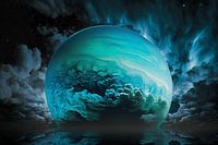 Een adembenemend kosmisch tafereel ontvouwt zich in "Celestial Sphere", waar een enorme, etherische planeet met wervelende blauwe en turquoise wolkenformaties het hemelse landschap domineert. De planeet lijkt te zweven boven een reflecterend, vloeibaar oppervlak dat zijn uitgestrektheid en ingewikkelde stormpatronen weerspiegelt.…
