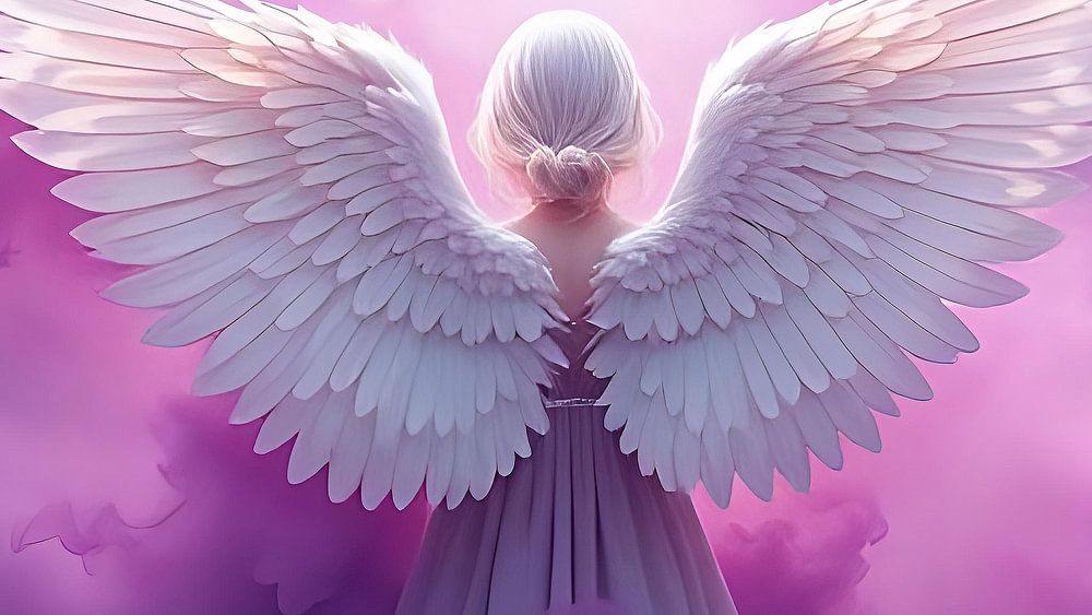 Het behang toont een majestueuze engel die zachtjes zweeft te midden van zachte, stromende wolken of delicate rook. De figuur van de engel straalt een aura van rust en vrede uit terwijl hij in een sierlijke pose is afgebeeld. De wolken om hem heen lijken bijna etherisch en creëren een dromerige sfeer die de kijker meeneemt naar een andere wereld.