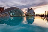 Het Hemisféric van Valencia op de voorgrond, met het Reina Sofía Paleis voor de Kunsten op de achtergrond, tijdens een zonsondergang, in de Stad van Kunsten en Wetenschappen. De Stad van Kunsten en Wetenschappen van Valencia is een van de monumenten van de hedendaagse architectuur in de stad Valencia. Het Hemisféric, een avant-gardistisch gebouw ontworpen door de beroemde Spaanse architect Santiago Calatrava, staat op een prominent punt in deze locatie, samen met zijn "zuster" gebouw, het Reina Sofía Paleis voor de Kunsten. Samen vormen ze de toegangspoort tot deze modernistische stad waarin het Wetenschapsmuseum, ook het werk van Santiago Calatrava, opvalt, want dat kan ook niet anders.