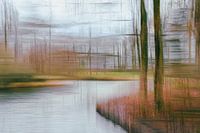 Landschap in het Hemmensebos in Hemmen, op de Overbetuwe in Gelderland. Hier is gebruik gemaakt van meervoudige belichting, waar twee foto's in de camera werden samengevoegd. Het betreft twee ICM foto's, ofwel intentional camera movement. Het vormt een abstract en schilderachtig beeld van de vijver en de bomen.