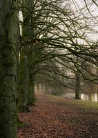 Portret in het park van Hemmen op de Overbetuwe in Gelderland. Je ziet een rij bomen in winterrust, en op de achtergrond de vijver, in het gouden licht van de opkomende zon.