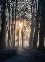 Landschap in het Hemmensebos in Hemmen, op de Overbetuwe in Gelderland. Het is een koude winterochtend, het is mistig en de zon komt op.