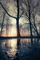 Landschap in het Hemmensebos in Hemmen, Overbetuwe in Gelderland. Het is nevelig en de zon komt op. Het gouden licht verspreidt zich tussen de bomen.