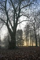 Landschap in het Hemmensebos in Hemmen, Overbetuwe in Gelderland. Het is nevelig en de zon komt op. Het gouden licht verspreidt zich tussen de bomen.