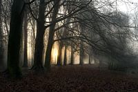 Landschap in het Hemmensebos in Hemmen, Overbetuwe in Gelderland. Het is nevelig en de zon komt op. Het gouden licht verspreidt zich tussen de bomen.