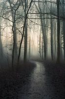 Landschap in het Hemmensebos in Hemmen, Overbetuwe in Gelderland. Het is nevelig en de zon komt bijna op. Dit zorgt voor een mystieke sfeer.
