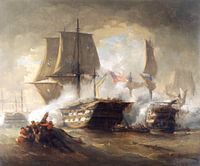 Tijdens een zeeslag gaat het er hard aan toe. Oorlogsbodems schieten op elkaar in de rook en drenkelingen proberen het vege lijf te redden.