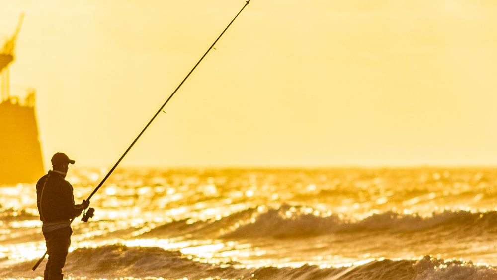 Sfeervol strandtafereel met avondzon en visser en scheepswrak in zee