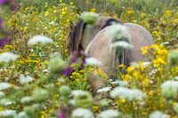 Foto van een konik hengst van achteren. Hij gaat op in een weelderige bloemenzee