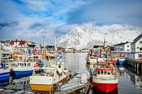 Vissersboten in de haven van Henningsvaer een vissersdorp gelegen op een aantal kleine eilanden voor de zuidkust van Austvagoya in de Lofoten archipel in Noorwegen tijdens een mooie winterdag met besneeuwde bergen op de achtergrond.