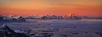 Mountains of Austvagoya island in orange sunset, Lofoten