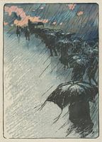 Op deze kKleurenhoutsnede lopen mensen met paraplu door de regen en de storm van de wind. Een simpel, droef en donker beeld van mensen die in een stoet achter paard en wagen aan trekken in een optocht.