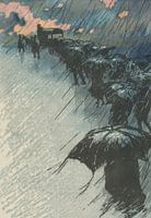 Op deze kKleurenhoutsnede lopen mensen met paraplu door de regen en de storm van de wind. Een simpel, droef en donker beeld van mensen die in een stoet achter paard en wagen aan trekken in een optocht.