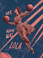 De tekst "Her name was Lola" is prominent aanwezig in het werk, met een speelse verwijzing naar de iconische liedtekst van Barry Manilow's "Copacabana." Deze verwijzing voegt een extra laag van narratief en herkenning toe, waarbij het beeld de toeschouwer uitnodigt om na te denken over het verhaal van deze fictieve Lola – een vrouw die het middelpunt van aandacht is, zowel in het circus als in het beroemde lied.