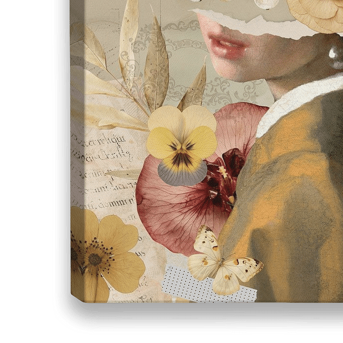 Dit kunstwerk combineert het klassieke portret met elementen van vintage en natuur, waardoor een unieke en intrigerende stijl ontstaat die zowel bekend als vernieuwend is.