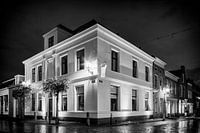 Het pand op de hoek van de Benschopperstraat en de Weidstraat in IJsselstein stamt uit de 18e eeuw. Het is ooit gebouwd als herberg. Tegenwoordig heeft het nog steeds een horeca functie en is Bar Brasserie Joris hier in gevestigd. Deze foto is een zwartwit uitvoering van een avondopname. Er is ook een kleuren uitvoering van dezelfde foto. Zie elders in dit album.