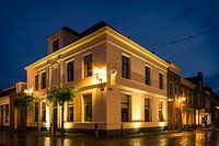 Het pand op de hoek van de Benschopperstraat en de Weidstraat in IJsselstein stamt uit de 18e eeuw. Het is ooit gebouwd als herberg. Tegenwoordig heeft het nog steeds een horeca functie en is Bar Brasserie Joris hier in gevestigd. Deze foto is gemaakt in de vroege avond avond. Er is ook een zwartwit versie van deze foto. Zie elders in dit album.