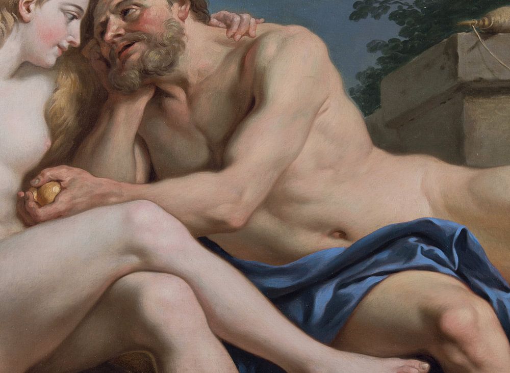 Op dit kunstwerk zitten de man en de vrouw beiden naakt met daarvoor een baby. De meid is te zien met benen, heup, buik en borsten ontbloot. Bij de kerel zijn benen, buik en torso ook bloot.