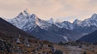 Herdenkingsplaats voor de gewonde klimmers bij Lobuche, Nepal in de Himalaya met boeddhistische monumenten versierd met gebedsvlaggen. Op de achtergrond is de machtige berg Ama Dablam (6.812 m) te zien.