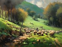 Dit is in een impressie van een schapenherder met zijn kudde schapen in een prachtig groen heuvellandschap. Dit is het tweede werk met dit thema.