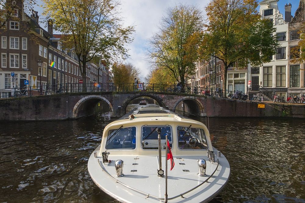 Deze foto, genomen bij de Herengracht in Amsterdam, toont een typisch Amsterdams tafereel met een rondvaartboot die rustig over de gracht vaart richting een van de vele karakteristieke boogbruggen. Aan weerszijden van het water staan de bekende grachtenpanden met hun smalle gevels en hoge ramen, omgeven door bomen waarvan de bladeren beginnen te verkleuren – een teken dat het herfst is.