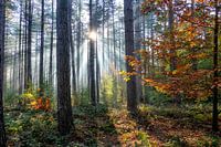Prachtige zonnestralen in een bos in de ochtend tijdens de herfst.