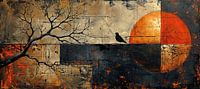 Herfst Abstract Schilderij | Embered Solitude - gestileerd herfstlandschap met vogel en abstracte zon