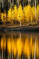 Herfstspiegeling van een espenbos in een vijver verlicht met middaglicht.