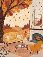 Koop de illustratie Herfst Comforts: Een gezellige woonkamer met open haard en uitzicht op het raam van Artistic als print op canvas, aluminium dibond, (ingelijste) fotoprint, behang en ArtFrame. Voor jou op maat geprint in Fine-Art kwaliteit.