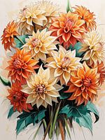 Dit levendige schilderij toont een weelderig boeket dahlia's met een boeiend samenspel van zachte, crèmekleurige gelen en rijke, vurige sinaasappels. De vloeiende vermenging van kleuren, waarschijnlijk bereikt met olieverf, benadrukt de ingewikkelde bloemblaadjes en voegt een gevoel van diepte en helderheid toe aan elke bloem.…