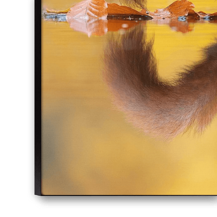 Een eekhoorn in herfstige setting met spiegeling in het water.