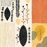 Moderne patroonachtergronden voor print, als vectorillustraties, zijn vervaardigd in de stijl van grillige abstracte landschappen. Ze bevatten primitieve elementen en maken gebruik van een aards kleurenpalet. De illustraties vertonen natuurgetrouwe weergaven van flora en fauna, en zijn opgebouwd uit verschillende lagen en lijnen. Hierbij wordt inspiratie gehaald uit primitieve volkskunst en de composities volgen gevormde canvassen.