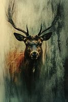 Het dier wordt omhuld door een mysterieuze mist of schaduwachtige texturen, die het hert lijkt te isoleren van zijn omgeving. De kleuren zijn warm, met een subtiele overgang van bruine, rode en groene tinten. De…