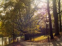 Deze foto is genomen op een zonnige herfstochtend in Utrecht. We zien een stadsgezicht met tegenlicht en warme herfstkleuren. De bladeren zitten mooi verkleurd aan de bomen. Het zonlicht komt dromerig door de bladeren heen, waardoor je zou wensen dat het elke dag herfst is. Ook schijnt de zon mooi door de sttraatverlichting heen. Door gebruik te maken van het tegenlicht in combinatie met een vinatage lens ontstaat deze sfeervolle foto,