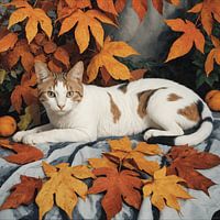 Dit schilderij portretteert een ontspannen kat die zich nestelt tussen kleurrijke herfstbladeren. De warme oranje tinten van de bladeren contrasteren prachtig met de witte en gevlekte vacht van de kat. De speelse opstelling van de bladeren en de ontspannen houding van de kat roepen een gevoel van comfort en gezelligheid op, perfect…