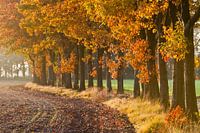 Een laantje tussen de kale akkers met zeer kleurrijke bomen in de herfst.