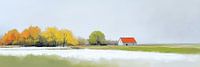 Herfst Lint - Een helder moment gevangen in stilte: het beeld opent met een rij bomen in vurige herfsttinten en een alleenstaande boerderij met een fel rood dak die als een kleine punctie in het landschap staat. De kunstenaar koos bewust voor die twee ingrediënten—de bomen en het dak—om het oog aan de horizon vast te houden. De bomen…