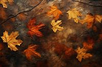 De compositie straalt een gevoel van rust en contemplatie uit, terwijl de herfstbladeren harmonieus samenkomen op het doek. De rijke, aardse kleuren creëren een warme en uitnodigende sfeer.