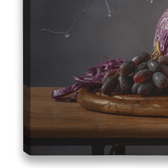 Herfst, de dagen worden korter, de bladeren vallen van de bomen, regen, de natuur gaat in rust. Wij zoeken de warmte binnenshuis met een glaasje port. We passen onze maaltijden aan. Stilleven met blauwe druiven, granaatappel, rodekool en walnoten. Samen met een kruikje en een glas port op een houten tafel.