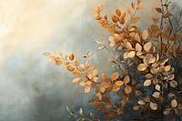 Herfst | Texturen van Herfstbladeren - Dit plantenschilderij toont een verzameling van subtiel getinte herfstbladeren met een achtergrond die overgaat van bleekblauw naar goudbruin, waarbij de delicate textuur van elk blad gedetailleerd is uitgewerkt.