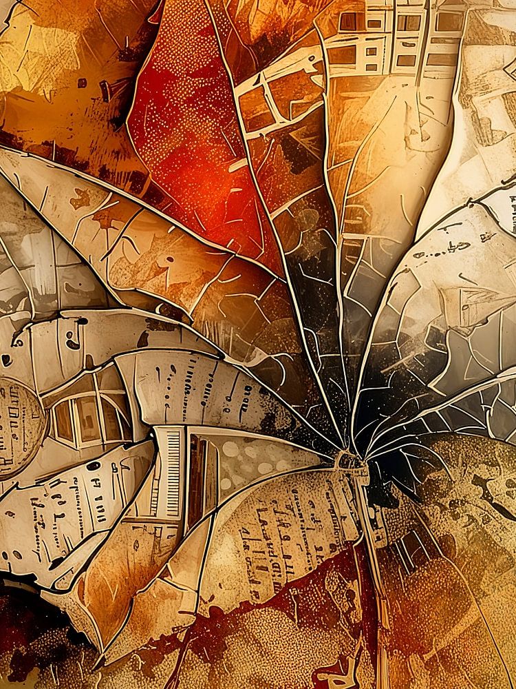 Dit mixed media-schilderij combineert de warme, aardse tinten van een vallend blad (roestbruin, goud, sepia) met bijzondere structuren en (fantasie) teksten.