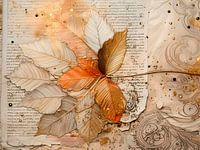 Dit mixed media-schilderij combineert de warme, aardse tinten van een vallend blad (roestbruin, goud, sepia) met bijzondere structuren en (fantasie) teksten.