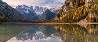 De berggroep Monte Cristallo wordt weerspiegeld in het herfstige Dürrenmeer in de Dolomieten.