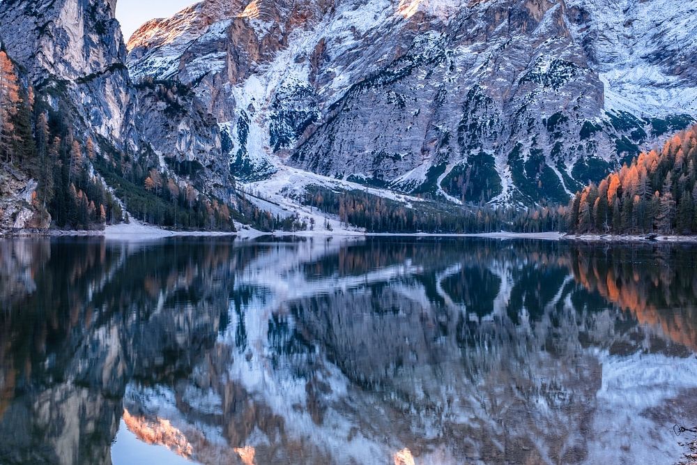 Zonsopgang bij het herfstmeer Braies in Zuid-Tirol in de Dolomieten