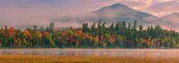 Panoramafoto van herfstkleuren en zonsopkomst bij Connery Pond, gelegen in North Elba, nabij Lake Placid in het noorden van de staat New York, Verenigde Staten. Het is de thuisbasis van een van de meest iconische uitzichten in het Adirondackgebergte.