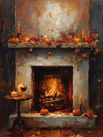 Decoratief herfstmotief met sfeervolle open haard en kaarslicht in warme kleuren, mysterieus, vintage, olieverfschilderijstijl