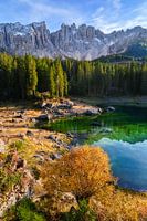 Herfst bij het Lago di Carezza met uitzicht op de Latemar berggroep in de Dolomieten / Zuid-Tirol