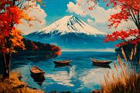 Een glinsterend meer weerspiegelt de majestueuze pracht van een met sneeuw bedekte berg, terwijl felrode en gouden bladeren langs de oevers groeien. Zachte bootjes deinen op de golven, omringd door de rust van de natuur. Een heldere hemel vol zachte wolken maakt deze vredige herfstidylle compleet en nodigt je uit om te dromen.
